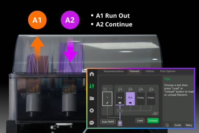AMS, poháněný 32bitovým MCU, senzorovými poli, akčními články a inteligentním algoritmem, dosáhl bezprecedentní úrovně inteligence. Odborně řídí zavádění a vyjímání filamentu spolu s účinnou detekcí a obnovou chyb.