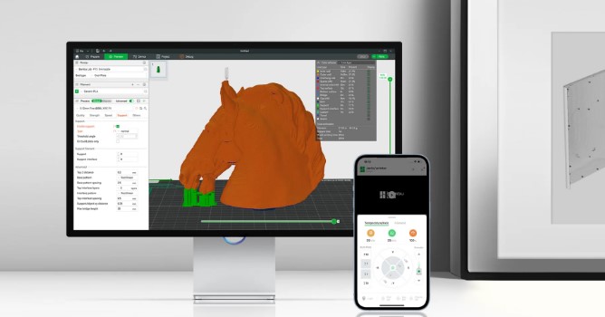 Dálkové ovládání a sledování tiskárny pomocí Bambu Studio nebo Bambu Handy. Prostřednictvím vestavěné kamery můžete také nahrávat časosběrná videa.